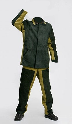 Куртка и брюки. Костюм с накладками из кожевенного спилка, ОП, толщина спилка 1, 1–1, 3 мм. Куртка с супатной застежкой, карманами в боковых швах.
